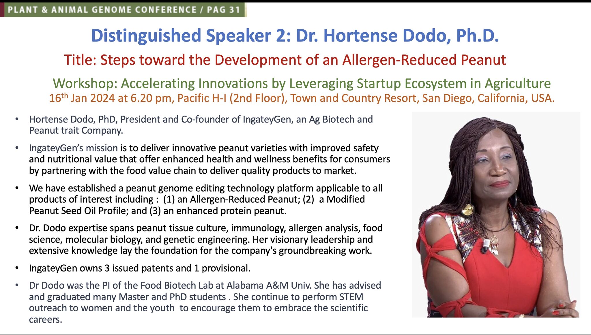 Join us for an evening of groundbreaking insights with our distinguished speaker Dr. Hortense Dodo, Ph.D., Co-founder/President, IngateyGen LLC, paving the way to discover the future of allergen-reduced peanuts and the pivotal steps in their development at the workshop on January 16, 2024, from 6:20 pm to 8:30 pm in Pacific H-I (2nd Floor) at the Town and Country Resort, San Diego, California, USA.